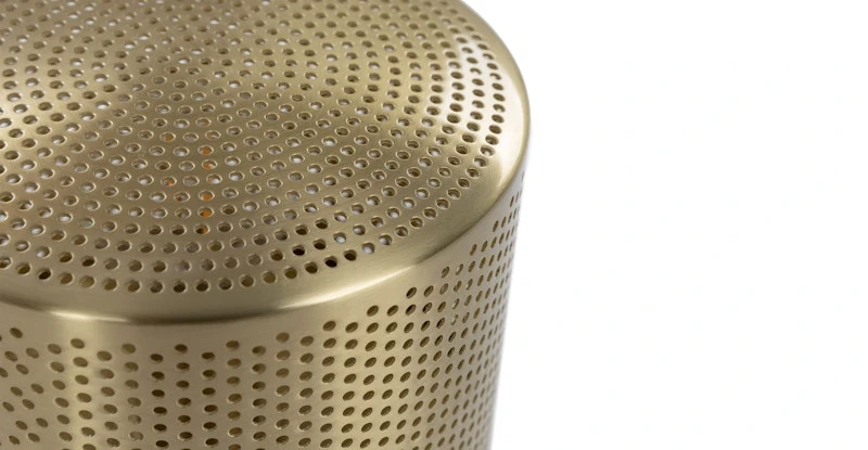The Perforate lamp looks great sitting atop a side table, or hung as a sconce on the wall. The punched-metal shade casts twinkly, subtle lights across your room. Extra shine provided by the metal finish, and neatly tied together with a fabric-wrapped cord.