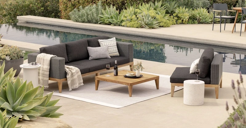 High end, low-profile. This sofa makes for easy conversation: the boxy, solid-acacia design is low to the ground, bringing an oasis-vibe to your poolside. The Urba Sofa was made for artful sprawling. Pass the lemonade.